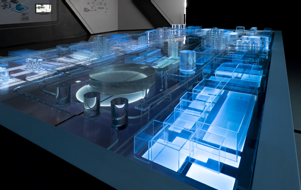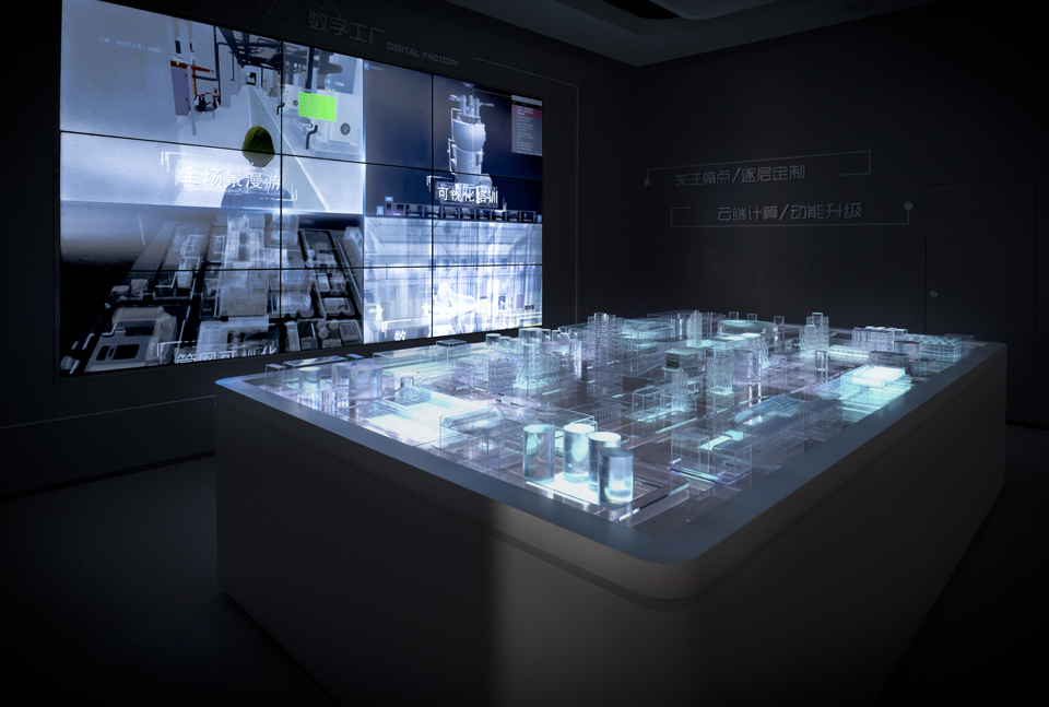 水晶工業(yè)沙盤與大屏聯(lián)動,用以介紹工業(yè)互聯(lián)網(wǎng)在“數(shù)字工廠”打造中的實際應(yīng)用。
