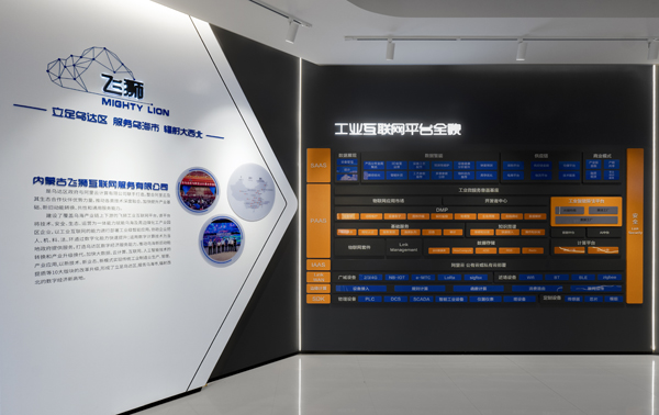 烏海飛獅是一家助推企業(yè)工業(yè)互聯(lián)網(wǎng)升級的企業(yè),展廳展示以5G技術(shù)與工業(yè)互聯(lián)網(wǎng)平臺為基礎(chǔ)支撐,