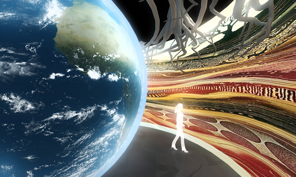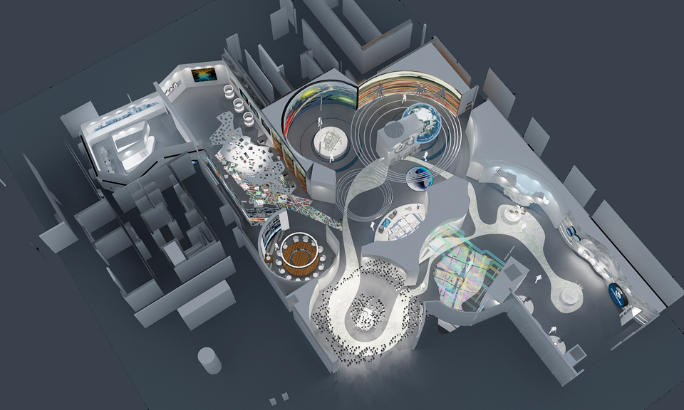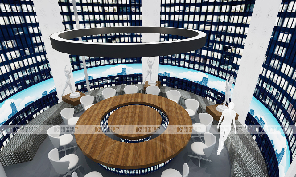 展廳序廳,以城市筑“蒼穹”,倒立的城市,寓意大數(shù)據(jù)正在顛覆傳統(tǒng)思維。核心藝術(shù)裝置, 鏈接天地,地面以江河形地圖,引領(lǐng)參觀者走入“大數(shù)據(jù)城市”。 |