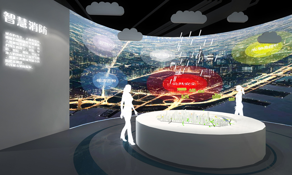 解密 · 不安全的城 在第二部分,參觀者“回歸”到市民身份,體驗(yàn)大數(shù)據(jù)為城市安全作出的貢獻(xiàn)。電子互動沙盤用以講解智慧城市住建, 環(huán)形投影用于展示地球物理環(huán)境,弧形屏讓參觀者清楚了解智慧消防的運(yùn)作系統(tǒng)。 |